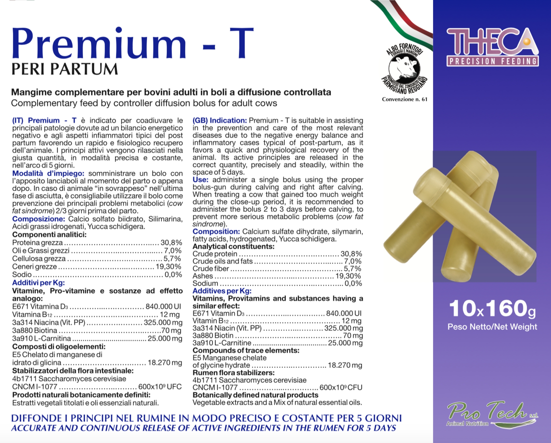 Somministrare un bolo (con l’apposita lanciaboli) 1-2 giorni prima del parto o al momento stesso del parto. Grazie alla capsula brevettata THECA, i principi attivi vengono rilasciati nella giusta quantità, in modalità precisa e costante nell’arco di 10 giorni.